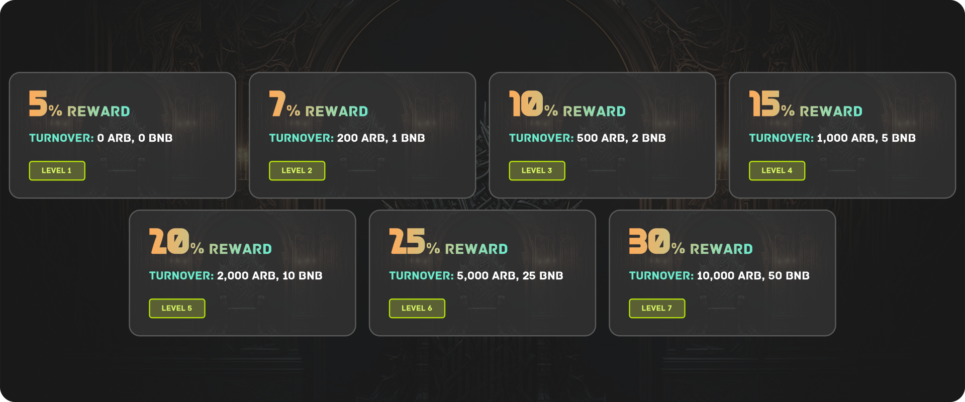 6. Attain the top-tier Level 7 by reaching a turnover of 10000 ARB or 50 BNB.